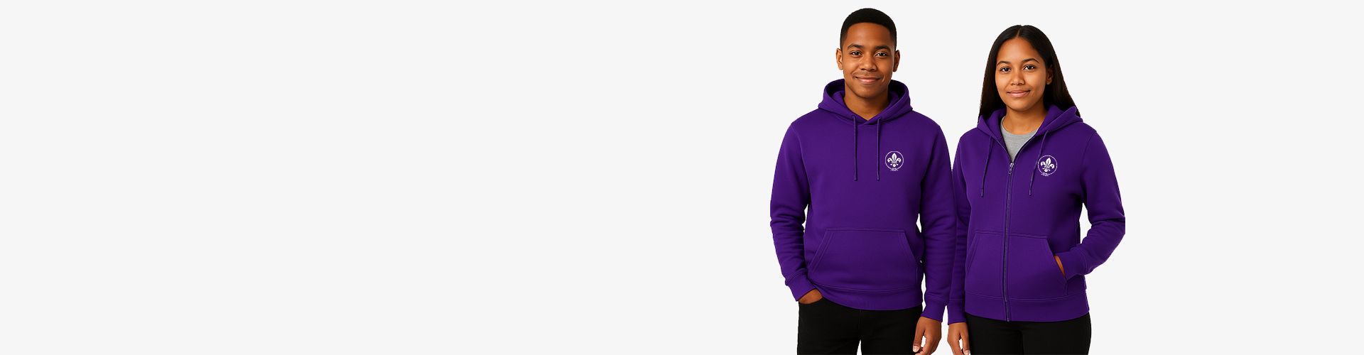Unisex zip-up hoodie in purple (#622599), with embroidered chest logo.