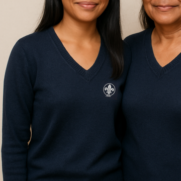 Elegant and practical, this navy blue V-neck sweater is made for cool weather while keeping a neat look. Suitable for both scout events and daily wear.