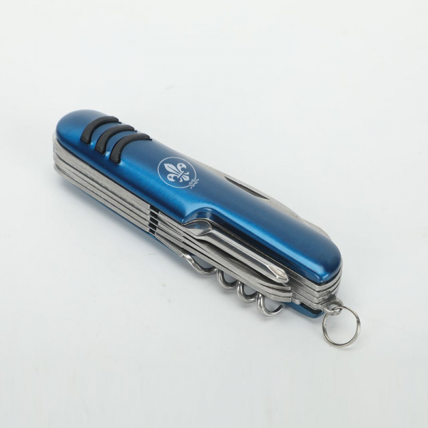 Ce couteau suisse multifonction est l’outil indispensable pour toutes les aventures scoutes. Compact et robuste, il intègre plusieurs outils pratiques comme lame, ouvre-boîtes, ciseaux, tire-bouchon et tournevis. Son manche arbore fièrement le logo scout gravé, symbole de fiabilité et d'engagement.
